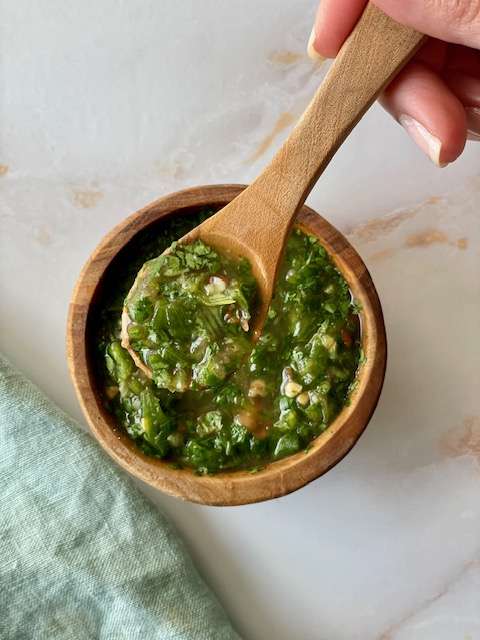 Aji pique (pronounced ahee-pee-keh) is a type of Colombian hot sauce. It is commonly served with empanadas, but it can be paired with any meal for an added layer of flavor. The heat comes from the hot pepper, but the cilantro gives this sauce a fresh touch. The spice level can also be adjusted by adding more or less hot pepper.