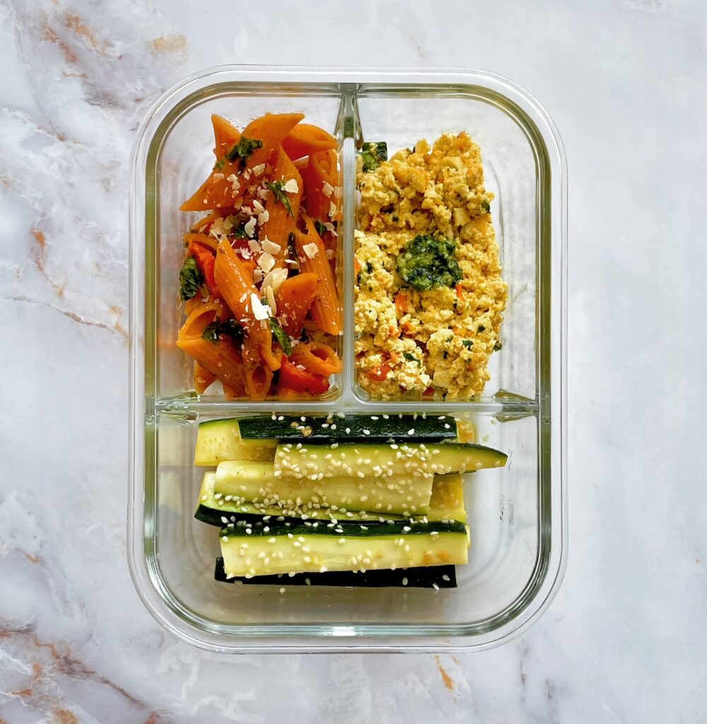 The menu this week is made up of: Red lentil pasta with basil and parm, tofu scramble with cilantro mayo, and sautéed zucchini with sesame seeds.